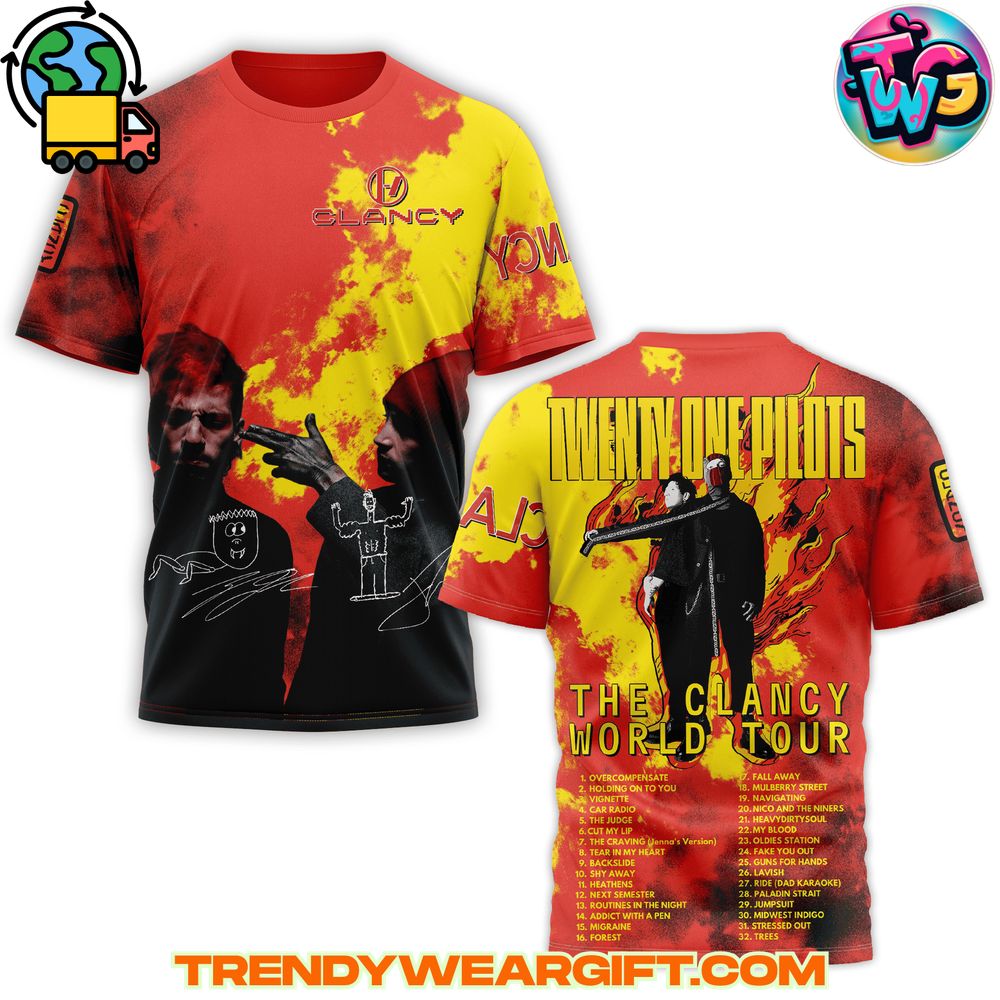 This Twenty One Pilots Clancy World Tour shirt features the iconic yellow, red, and black palette that reflects the dramatic visuals from the Clancy era. Abstract flames, signature hand-drawn artwork, and tour-related graphics capture the duo’s evolving artistry. Every detail of the Twenty One Pilots graphic tee symbolizes emotion, resistance, and rebirth — key themes longtime fans instantly recognize.